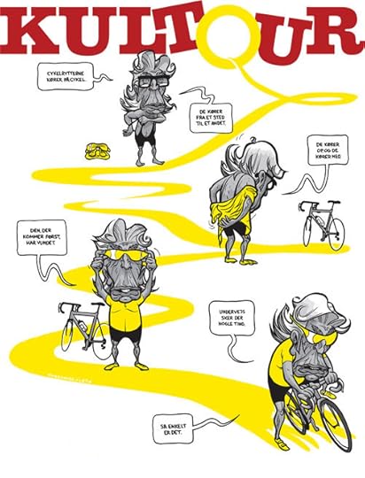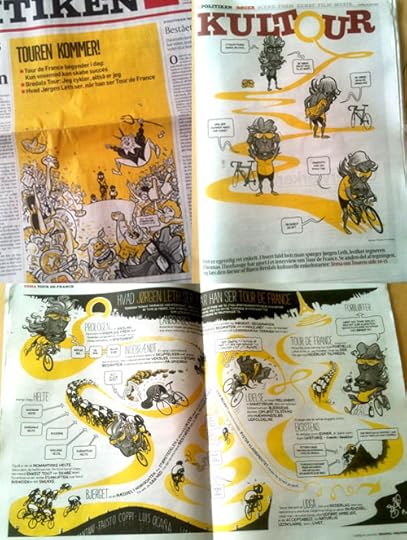 I dag – lørdag den 30. juni – har jeg et ret omfattende indslag i Politiken. Det er min tredje tegneserie om og med Jørgen Leth, men denne gang med særligt fokus på Tour de France, som sjovt nok også starter i dag. Indslaget er delt i tre: på forsiden af første sektion (i avissprog ‘A-forsiden’) markeres scenen, på forsiden af Kultur træder manden (Jørgen Leth!) i karakter, og på midtersiderne åbenbarer løbet sig i al dets mytiske og legendariske vælde.