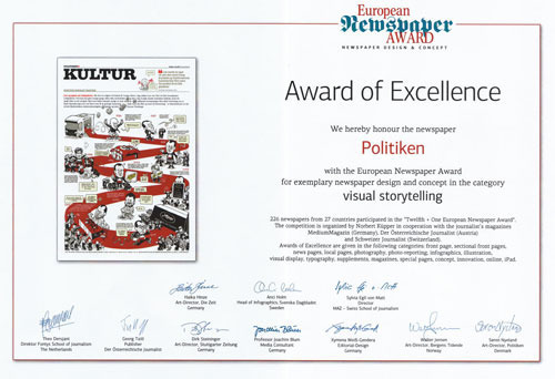 Forleden fik jeg dette fine diplom stukket i hånden, og det er naturligvis en anerkendelse, jeg er meget glad for. Forsiden, som blev bestilt af Politikens kultur-souschef Kasper Steenbach, skildrer Lars von Triers ægteskab med Cannes gennem årene, og blev bragt få dage inden naziballaden eksploderede i det sydfranske. Jeg er særligt glad for at præmieringen falder i kategorien ‘visual storytelling’ fremfor f.eks. ‘Illustration’.