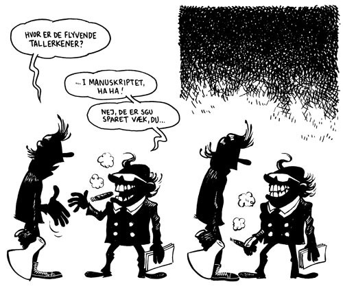 Anyway, alle skisterne til den historie er ganske rigtigt i min notesbog, som jeg beklageligvis havde forlagt i flyet. “Åh. D-det er en misforståelse. Jeg har ingen planer i den retning, det beklager jeg…”. “Det ved vi godt, for vi googlede dig, og fandt ud af at du er tegneserietegner. Din bog vil blive afleveret til dig ved din afrejse i overmorgen.”
