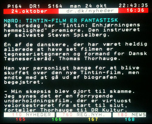 I virkeligheden er det en stor ære at klare cuttet til tekst-tv, medieformatet der som bekendt kun har få sider og få ord til rådighed. Jeg havde forinden en sjov tur i biffen med hovedparten af Danmarks filmkritikere – det er selvfølgelig Spielbergs nye Tintin-film, vi snakker om – og deltog bagefter i en civiliseret lynsamtale med DR Kulturnyts Tore Leifer, og så tilbage på tegnestuen. Få timer senere skete der så det, at jeg blev jeg forvandlet til en “nørd” på tekst-tv – er det bare cool eller hvad?
