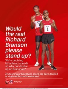 The facts first: the Farah/Bolt print ad is a new campaign, launched across a number of national newspapers at the weekend. Virgin Media has signed up the Somali-born long distance runner in an open-ended deal estimated to be worth £500,000. The campaign has been created by BBH. Jeff Dodds, executive director of brand and marketing communications at Virgin Media, said: “After delivering a stellar performance in the Olympic Games, Mo has found a special place in all of our hearts and is a fully fledged national hero. We’re absolutely delighted to be working with him. Virgin Media is all about delivering brilliant entertainment, and nobody has got the nation cheering at their TVs more than Mo over the last couple of weeks.”