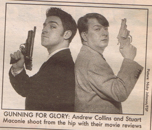 To cite a really remote personal example: in the mid-90s, when I was the editor of Q magazine, Stuart Maconie and I had our photograph taken by ITV publicity to promote our film review show The Movie Club. We arrived at the photo studio to find racks of humorous, movie-related costumes. I took umbrage and had what must be one of five tantrums I have ever had in my professional life, refusing to wear any of the stupid wigs or costumes. I explained that I was, by day, the editor of a magazine, a job with a certain amount of responsibility, and that being photographed looking a dick would work against that. We found a compromise, and used some props, and it was all fine. But what I was trying to preserve was my dignity, I guess. Typically, only one shot from the session was ever used anywhere, in black and white. This is it.