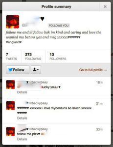 I have learned a lot about a certain demographic since this started happening: largely American, sometimes Latino, always young, as in young enough either not to be able to spell, or too buzzing with youthful energy to have time to do anything as bo-o-oring or lame as spell (or too non-English-speaking to be able to spell in English, let’s be fair), and hopelessly devoted to one of three international pop acts – a young man, an older woman, and a group. I have learned about them not through choice but because, overnight now, without fail, at least a dozen of them follow me with their ♥s and their “xoxo”s and their desperate entreaties to “follow me bak”. I block them all, which is boring, and time-wasting, because they are either following me by mistake, or because they follow anybody, or because they aren’t real (you never can tell on Twitter), or because they are using software to automatically follow people in order to accumulate “follows”. It’s a mad, self-serving, insular world, albeit one populated by millions, and I wish no part of it.