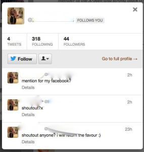 I do not profess to understand very young people. But sociologically, it’s sort of morbidly fascinating to see how their minds work with regards Twitter (a social networking service I use to communicate with other adults). They seem to be understandably deluded into thinking that if they Tweet either of the two pop singers mentioned, the pop singer will follow them back automatically. Hey, maybe this is the case. It certainly looks as if all they want is affirmation. A “follow back” is the ultimate prize. I personally couldn’t give a monkey’s who follows me or not. It’s their choice. I am happy to have them onboard, but I didn’t seek them out. The young fans of the pop singers seem to spend an awful lot of time begging to be followed, as if following was a meaningful act.