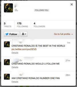 An influx of what I will very carefully and gingerly descibe as fans of “the pop singer” (yes, that one, the one beloved of very young people whose name trends more than any other; him) has started to bother me. They’re not evil people, but I surmise that they should not really be following me. Why would they want to? What’s the connection? Every morning I find I have to weed them out, and block them, for their own good. It’s almost as if they are robotic followers, and not real people, but even if they are real, a cursory glance at their pithy one-line description (which will invariably involve hearts – which I don’t even know how to type! – and “xxxx” and “xoxo” and combinations thereof) and their recent Tweets (which mainly seem to be sent to other pop stars for young people, particularly a female pop star who wears funny outfits, or to “him”, entreating the recipient to “follow me back xxxx” or “follow me bak”, as they do not care for the English language) marks them out as aliens.