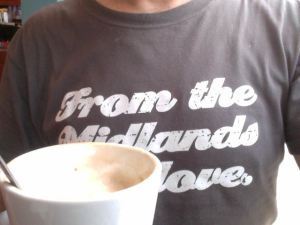 Phew. Anyway, I’m in a local Caffe Nero, as I couldn’t face the commute to King’s Cross. (Hence: no commute soundtrack today, sorry.) As you can see, I’m wearing my “From The Midlands With Love” t-shirt, as it feels like a summer day, and because I am from the Midlands with love. This is a rare garment in my current wardrobe, as it has words on it. (I’ve long since stopped wearing “band” t-shirts, and in fact, rarely wear t-shirts any more, in a deluded bid for maturity. Maybe I would wear t-shirts if I was a “festival dad” but I don’t have that parental excuse!) The slogan refers to Miles Hunt and The Wonder Stuff’s ongoing, civic seven-inch covers project which you can read about here (and see some videos). I like the t-shirt.