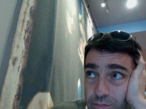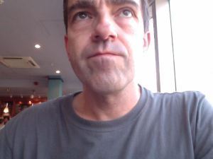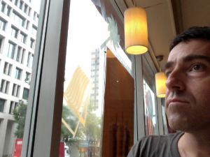 Well, the beauty of working near your house is that you can go home for your lunch, rather than cart it around with you, as I normally do. I rather skilfully remixed the last portion of this week’s chilli with the first portion of my latest soup. A thrilling mash-up, it picked me up a bit when I needed it. I am now back in a coffee shop, but a different one, where I am nowhere near a window but very near a wall-hanging of something Italianate and esoteric. (I resent the dominance of Caffe Nero in my working life, as they charge extra for soya milk, which is a scandal, but they do offer wi-fi, which clinches it every time, and their loyalty card is – I think – the most generous of all the chains.) I am trying to look melancholy in this pic, but I’m not very good at it. I have a beautiful smile, ordinarily, which is key to my athletic prowess, but I haven’t been using it in these diary pics, as who wants to sit and smile at their laptop in public?