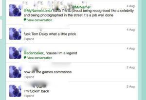 Now, I deleted my mentions of Tom Daley’s Twitter troll from Twitter yesterday, as by even mentioning this damaged individual on his favourite forum risks glorifying his actions further. As you can see, I even smudged out his @Twittername in the grab I made. (Anyone who has cared to follow this obnoxious story will know that he’s @Rileyy_69 – which seems safe to mention within the unsearchable sancity of this blog entry – but I sincerely urge you not to visit his feed.) He seems to have been released by Dorset police after his malicious Tweets to Daley, although I understand a whole litany of previously offensive Tweets, some of them overtly racist, are still to be investigated. But if he’s under caution at all, he really ought not to be broadcasting on Twitter. And yet, he is, and full of himself. He’s obviously proud of being “famous” and “a legend”, and of putting on over 30,000 new followers since he entered Daley’s radar, and he’s in fact back to insulting Daley, albeit not using the diver’s @Twittername this time. So he has learned something.