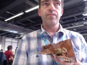 Packed lunch: same chilli as yesterday. No complaints from me. I brought two of the homemade almond/dried fruit/espresso biscotti I made on Sunday, which have come out rather well, but they are exclusively for dunking in a coffee, and I am denying money to the Peyton & Byrne cafe in the Library at this particular junction by drinking their free tapwater. The biscotti can, in this instance, come home with me and be dunked in a non-machine-made coffee in front of the telly. I made 28 individual biscuits, and intend to eat no more than two a day. I’m disciplined like that. I would have made a good monk.