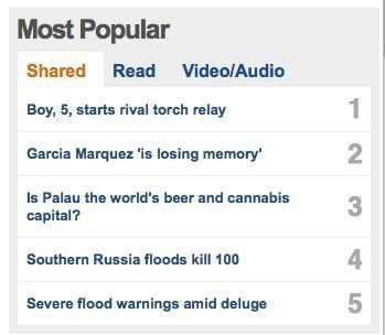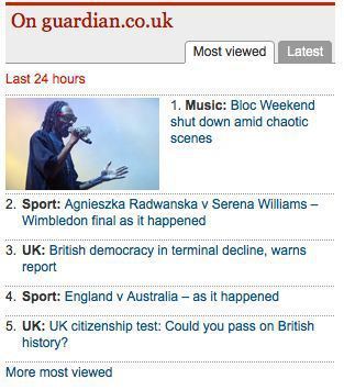 Consider the list of “favourites” that appears on every self-respecting website – some of which can be seen above, but you know what I’m talking about: the most popular entries on a blog, most read stories on a news site, the “trending” topics on Twitter. If ever there was a self-fulfilling algorithmic prophecy, it’s here. Because once a “popular” story appears in the “most popular” panel, it’s far more likely to be clicked on, and to remain popular. This is how a search engine like Google works, isn’t it? And how something like Charlie Bit My Finger can remain one of the most watched clips on YouTube even though it’s barely worth a look.