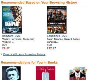 Perhaps it’s a benign public service to constantly shuffle things to the top of charts, so that we only need trouble ourselves with what’s already popular. But I worry – and I know I shouldn’t – that perhaps this accepted algorithm is killing our freedom of choice. There are a lotta books on Amazon. There is no meaningful way you can “browse” the site, despite the use of that word; in reality, you’re at the mercy of having books suggested to you based on … books you’ve previously looked at. Never mind books you’ve previously bought. I must admit I sometimes use Amazon as a journalistic resource. It’s free! But if you look a book or DVD up, for research, it will affect what other books and DVDs Amazon hawks at you. “Like this? You’ll love this!” Not necessarily. Amazon currently thinks I want to buy Coriolanus on DVD, because I recently looked up the BBC Television Shakespeares box set simply to see how many discs were in it for a link in my Telly Addict column. Fail!