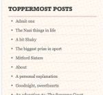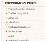 I wanted something a little cleaner, and clearer, and plainer. This is the one I’ve chosen. As you can see, I’ve brought the Mitfords banner with me, and the “widgets” are the same. I hope you find it easy to navigate and read. (For the record, the “theme” is called Twenty Eleven in the “theme” catalogue. That’s me: living in the past.) I’m open to comments. As ever.