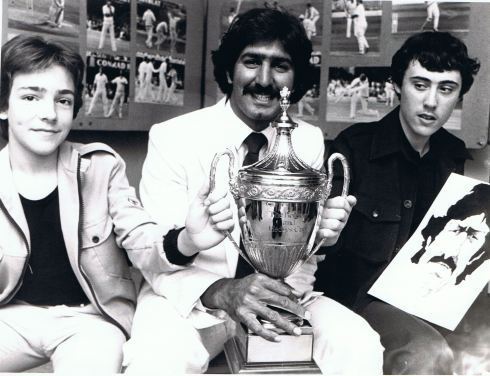 Here is a photo of myself and my friend Paul with Sarfraz Nawaz, Northampton cricket star. It was taken for the Chronicle & Echo by the Chronicle & Echo at the offices of the Chronicle & Echo, where a reception for the team was laid on in 1980 after they’d won the Benson & Hedges Cup, and Paul and I were invited to attend as we’d drawn caricatures of the whole lot of them. It’s an event I look back on fondly. The closest I came to a Jim’ll Fix It, although I hated the turquoise suit Mum made me wear.