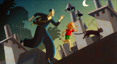 The way le chat "spoke" (ie. miaowed and purred and hissed) was realistic, and despite the stylised animation, which rendered human bodies and faces as 2D geometric shapes, shaded by a Marc Chagall-like "pastel" shadow effect, our feline protagonist was made fur and flesh in a convincingly catty way. However, it was the humans who ruined it. The story, about a little girl rendered mute after the death of her policeman father at the hands of a dastardly villain who finds her voice when she discovers that her cat is leading a double life with a lithe and seemingly benign burglar, may be centred around the pet, but it is largely populated by people who are little more than, well, caricatures and archetypes. They are not without style (I liked the dainty way their feet were animated), but the humans are sucked of all charm by the woeful quality of the English voices.