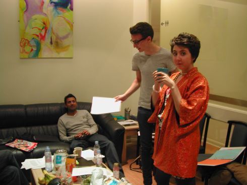I will attempt to blog more regularly this time, and add pics as and when. As you can see from the pic above, taken by the spy Michael Legge on the way to the read on Monday, just over half of the original cast are back. It's been something of a nightmare trying to reconvene the actors from Series 1, during which, for producer/director/script editor Anna, the word "availability" has been the bane of her life. As you can see, we have Mark Benton back, as well as Justin Edwards, Javone Prince, Navin Chowdhry and Michael, but the parts of Jax, Charlie and Robbie have been re-cast. So we welcome Claire Skinner, Rosamund Hanson and Tyger Drew Honey to the family! (The observant will have spotted that Claire and Tyger have already developed a fictional mother-son relationship on Outnumbered, so that worked out rather nicely.) Although it is sad when some of the original cast can't come back, you have to admit, we've been very fortunate in being able to fill their big shoes with some big feet.