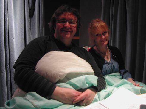 Below, we see Mark and Claire Skinner, as Harvey and Jax. The scene they are recording involves the couple being in bed. This is why they are doing some top quality "quilt acting" as it's known in the trade. No, it's not a sex scene. Mr Blue Sky is family listening.