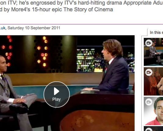Jonathan Ross, that is. Me, too. He has been away from the chat show circuit for 13 months. I was away for last week's Telly Addict – well, not away, that would be quite strange, but I had too many other jobs on, including a 6 Music show at the very time I shoot at the Guardian on a Friday morning, and I couldn't physically squeeze it in – but I'm back in the chair at an angle again this week, reviewing, yes, Saturday Night With Jonathan Ross (as it isn't called) on ITV1; the brilliant Appropriate Adult, also on ITV1; and Mark Cousins' epic The Story Of Film, on More4. That is all. The link is here.