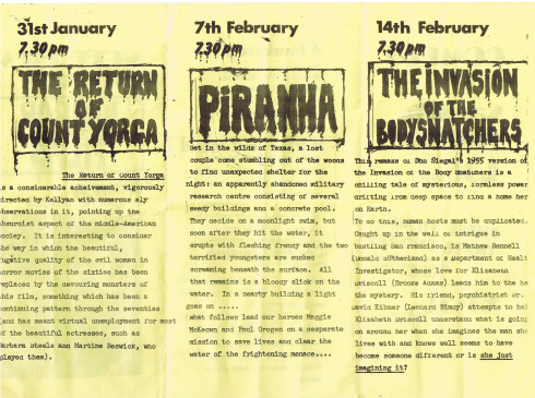 I was not yet a member of the Film Society when I saw Invasion Of The Bodysnatchers – part of a special, leafleted Spring '80 Horror Films Season along with Piranha and The Return Of Count Yorga – but a guest of my friends Neil and Dave, a pair of what would these days be called nerds from the Trinity School side of town whom I'd fallen in with at Saturday morning art classes at "the Tech", and whose trendy English and Communications teacher Mr Tilley had been their link to the Film Society. Without perhaps fully appreciating it at the time, Neil (feather-cut, rainbow braces) and Dave (Phil Oakey fringe, green v-neck) were to be my passport into a new world and, ultimately, a fast-track to adulthood. That Film Club, as we knew it, would one day help qualify me for a career in film criticism would have been purely abstract at the time.