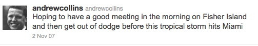 Did he perish in the tropical storm – officially, Hurricane Noel – which moved in from Haiti and Cuba to the Florida coast in November 2007 and up the Eastern seaboard as far as Canada? It's a horrible and sad thought. But you wouldn't be human if you didn't wonder. Who was Andrew Collins of Miami? From his other Tweets we discover that he was a Red Sox fan. He only followed three other "people", all connected with MIT and its Sloan School. (Hey, back in 2007, there were far less people to follow. If he did get bored with Twitter, who can blame him?)
