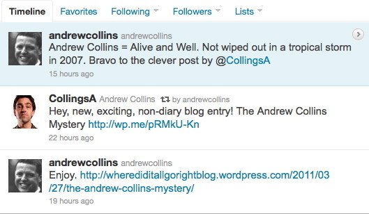 If I was a proper journalist, or someone looking to write a book, I'd take it further, but I thought I'd share it here anyway. Who is Andrew Collins? And why did he stop Tweeting in November 2007?