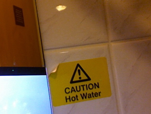 I even photographed it, because I can. It was accurate, in the sense that the hot water tap beneath the sign on the sink, helpfully marked out with red piping, did indeed produce hot water, when you turned it. The cold water tap, in blue piping, produced cold water. I ran that hot tap for a good long time when shaving, and even at its hottest, it was just above lukewarm. There really was no need to warn me of its temperature with a specific yellow sticker on the wall. CAUTION Water That's Nothing Like As Hot As You Expect It To Be, might have been a more helpful and pertinent sticker.