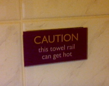 This is not a surprise. It is a heated towel rail. It is designed to get hot. The switch that turns it on and off was outside the bathroom door, and clearly marked TOWEL RAIL. I did not turn it on. It did not heat up. But had I chosen to do so, in order to use up some more electricity while in the room, I would have pretty much expected it to "get hot." I am not actually complaining about my stay in the Premier Inn, which was perfectly serviceable, and didn't cost me that much money. But these danger signs are becoming more and more common, their insidious application to walls and other surfaces clearly driven by fear of litigation, which is one aspect of American culture I was hoping we'd keep at bay, along with prom night, the rude phrase "can I get?" and guns, but we are losing the battle.