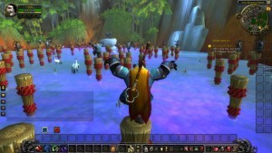 The minute I encountered this quest, I shouted, “Ranma 1/2!” Oh yes, my friends, I loved seeing Pandaria’s Singing Pools and remembering how often Ranma would tell his “Old Man” that he was going back to China and Jusenkyo to find a way to cure the curse he’d acquired by falling into the cursed spring of the drowned girl. Right then and there, I was happy I’d created a male panda because there’s a fun element in balancing on those poles as a big “Old Man” panda. *giggles*