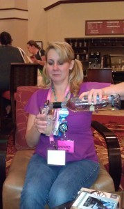 Later in the evening, I pitched in to help with the Carina Press Pictionary event. That was incredible fun! Many of the authors of Carina Press were there to help with the game and giveaway prizes. Laughter, shouts and general hilarity ensued. We closed out the night in the lobby again, having been a mission to polish off a couple of bottles of wine. Keri Stevens and Dana joined me to meet the challenge.
