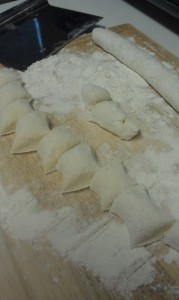 Dust your hands and work surface with a little flour. Break off a tennis-ball sized piece of the dough and place the rest back in the refrigerator. Roll the dough in had into a log about 3/4-inch thick. Using a pastry blade or sharp knife, cut the log into 3/4″ pieces.