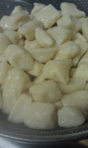 Add 1 tablespoon of salt to the water and the gnocchi. Gently stir the gnocchi to make sure they don’t stick. Once they bob to the surface, let them cook an additional 2 minutes. Drain using a colander.