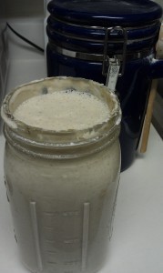 Sourdough starter is a live yeast culture. I keep it in a large mason jar in the refrigerator and feed it flour and water about once a week – and, according to Stella Price, I also feed it souls
