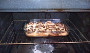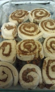 Beginning with the short end, roll up the dough to make a log. Cut the cross-wise dough into 1 inch slices. Arrange them flat in the tin(s). Cover and let rise for about an hour or until they’ve doubled in bulk.