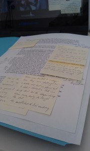 Yup. I save them for the plane ride or the quiet hour at Barnes & Noble. Trusty sticky notes and pen in hand, I go through them again and start making notes, brainstorming and doodling. The doodling part is important for the creative process, trust me.