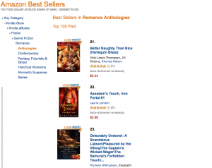 1.ASSASSIN’S TOUCH made Amazon’s top 100 Kindle Romance Anthologies list! (That’s the category for short stories and short story collections.) Thank you, Readers! I’m totally thrilled that so many are reading the first installment in the Iron Portal series.