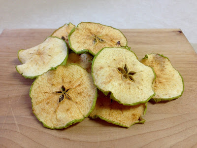 For the apple chips, slice with a mandolin slightly less than 1/8 inch. Sprinkle with cinnamon and dehydrate for 8-10 hours at 135F.