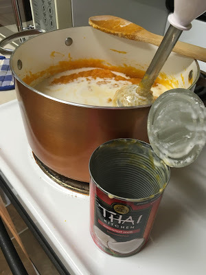 In a large pot put 2 TBS of red curry paste. Heat on medium until warm, about 2-3 minutes. Add the pumpkin 2 cups water and 2 TBS of extra virgin olive oil. Using an emersion blender, puree until smooth. Add one can of coconut milk, 1/2 TBS chili powder, 1/4 TBS curry powder, and one clove of garlic. . Salt to taste. Simmer until you cannot stand the smell any longer and MUST ladle yourself a giant bowl full.