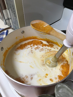 I eat pumpkin all year round. Love it in cookies and bread and energy bars. When the bright orange gourds start showing up in the stores and farmer's markets it is time for soup! Pumpkin Soup! Made with the real thing and not the canned puree. Here is the recipe in photos.