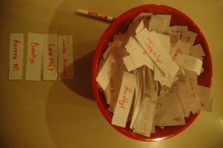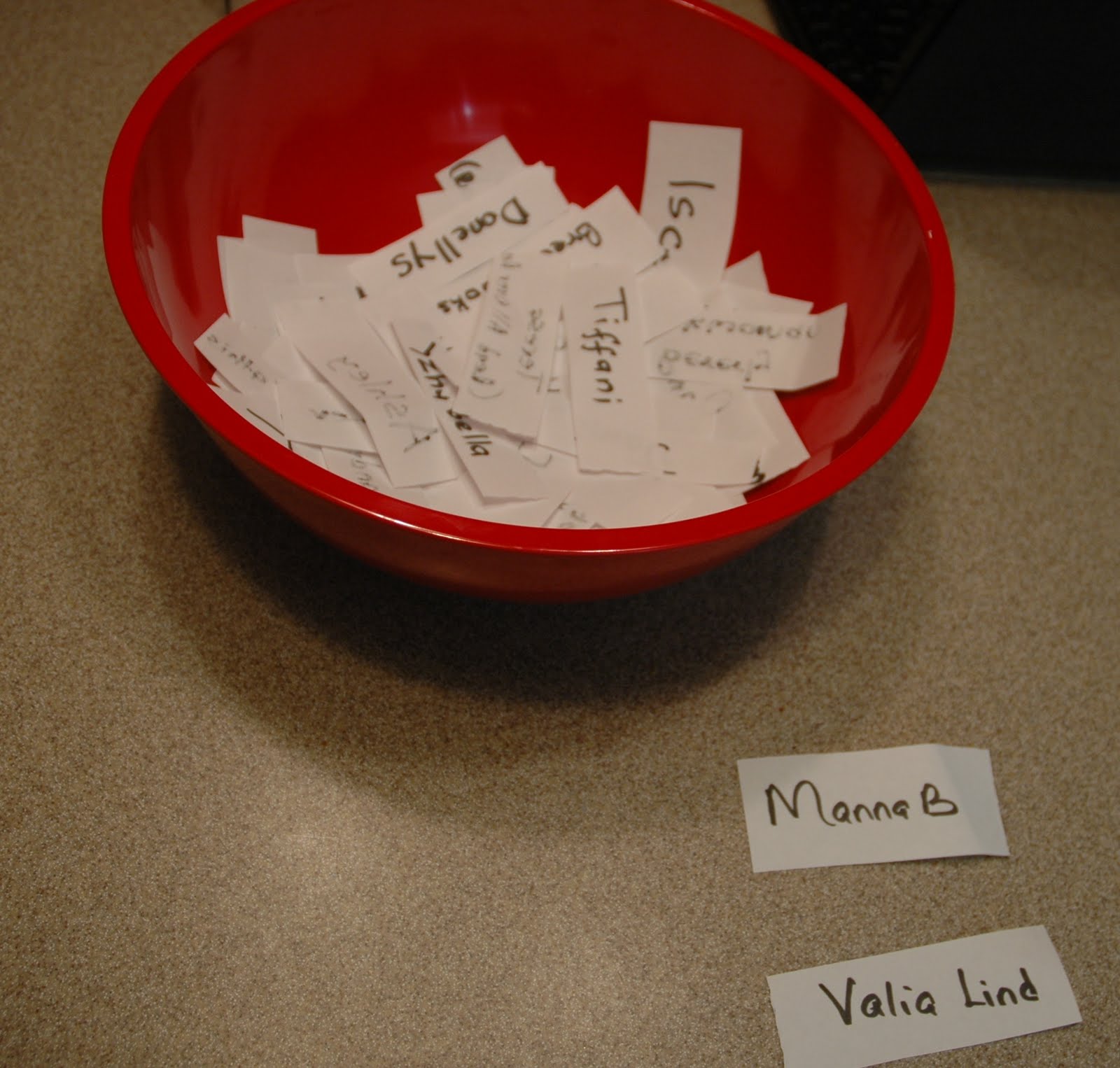 Dang it! I was going to video take the picking of the winners, but I realized I had no idea how to transfer the video onto my laptop. Here's my favorite red bowl with teh entries: