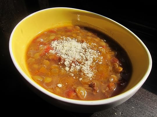 I made this discovery one chilly evening this spring when John’s partner, Thomas (the chef in that family), wasn’t around. Instead of ordering in, John decided to cook up some soup instead. I remain grateful for this decision as this meant that I got to taste his lentil soup, which turned out to be so hearty and tasty that I distinctly remember the delicious sensation of its earthy goodness warming me up from within.