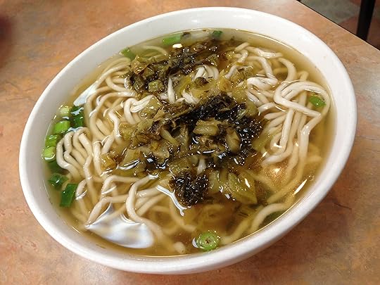 Then, the noodles — the broth was light, slightly salty and porky but what really made the dish was the gobs of pickled mustard greens on top of it.