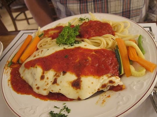 While this was not much like any Asian grilled pork chops I’ve tasted, it was edible. The house-made chili sauce was another matter, though — this was, again, intensely sweet. (In fact, it looked and tasted just like the bottled sweet chili sauces I’ve purchased at Asian groceries for sous chef, who is partial to them.) What we couldn’t figure out was what the gritty coating of crunchy bits on top was — after a few tastes, our best guess was Kraft grated parmesan cheese.