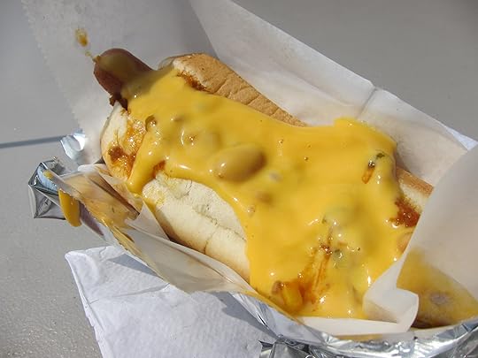 We get a Breezy dog ($3.50) — beef hot dog, topped with melted cheese and chili. The bun is soft, the hot dog is basic but the overall combination of meat, sweet roll, just a thin layer of chili and a river of runny cheese is delicious, hitting the spot immediately.