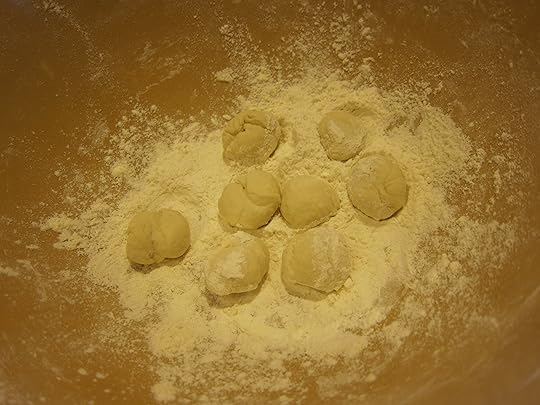 Next, toss those pieces (which are about slightly more than a tablespoon of dough) in flour.