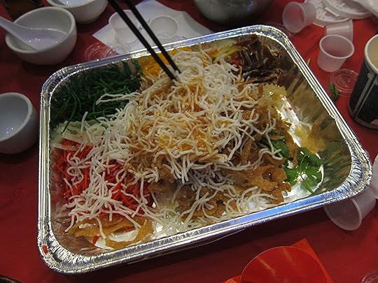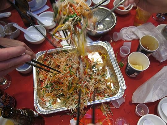 As you add each ingredient, you’re supposed to shout out the cheng yu (old Chinese saying) that conveys this wish. When adding the plum sauce, for example, you’re supposed to announce “Tian tian mi mi,” which means “sweet as honey.” When the raw fish goes in, you yell “Nian nian you yu,” wishing you wealth for the year. (The Chinese word for “fish” is a homophone for “wealth.”)