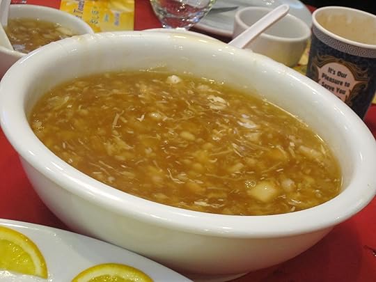 The crab meat soup with dried bamboo shoot was clearly meant to be a substitute for shark’s fin. Even with the addition of a hefty amount of tart red vinegar, the soup largely tasted like watery corn starch.