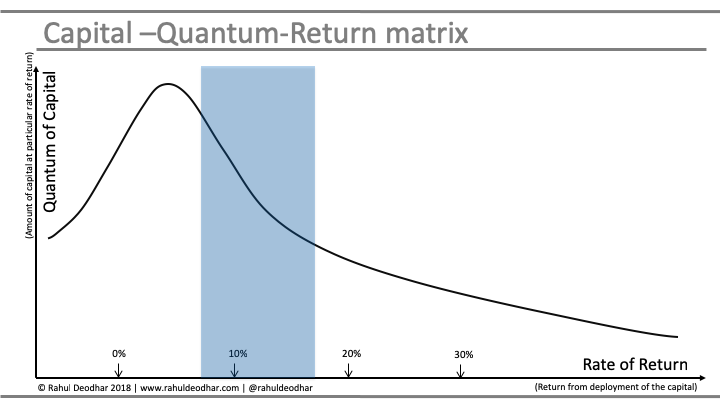 Capital Quantum and returnThe diagram shows the amount of capital demanded and its possible rate of return. The distribution is made from capital requirements of various businesses of various sizes. The financed part is the blue rectangle. The width of this rectangle and its location is determined by various factors. Now our experience tells us following details - (1) smaller businesses have higher risk profile whereas larger businesses have lower risk profiles; (2) smaller businesses have smaller quantum requirement whereas larger businesses have diverse capital needs; (3) as a corollary projects with large quantum of capital requirement and low return are dominated by large corporations.