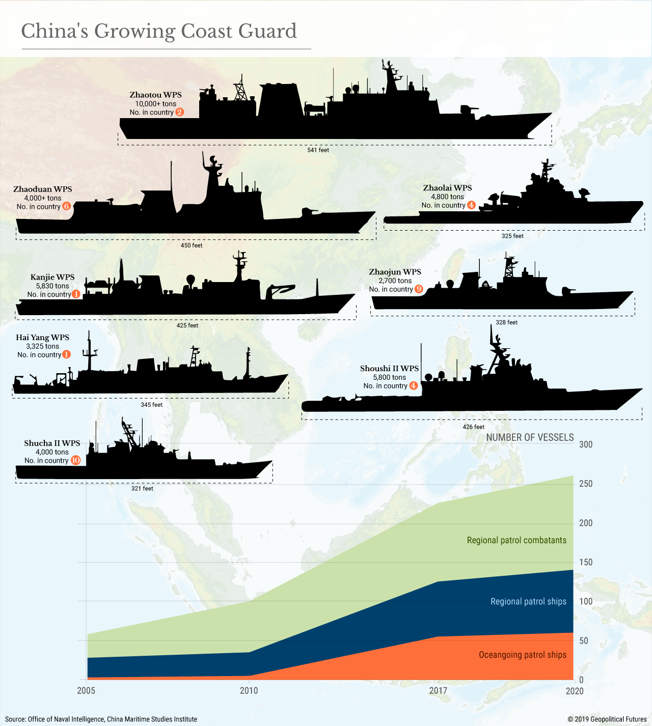 As per the report, China has merged few of its departments that had its own patrolling capabilities into a Chinese Coast Guard. China has also used commercial fishing vessels to further its scouting and minor naval defense capacity. GPF shows this graphic about changes to Chinese Coast Guard. From GPF.