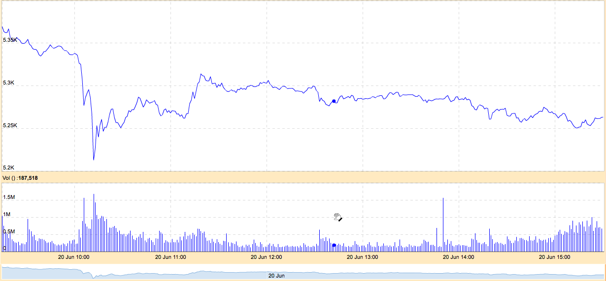 Third, look at the sharp fall with volumes. I guess a first trigger is through some algorithm at play rather than a thinking trader. The later drop down is more from margin calls being triggered than any fundamental issue. It is possible the algorithm may have estimated a fall to 5275 levels and adjusted to this very quickly triggering a panic in the process. It looks more like a work of computer than a human being.