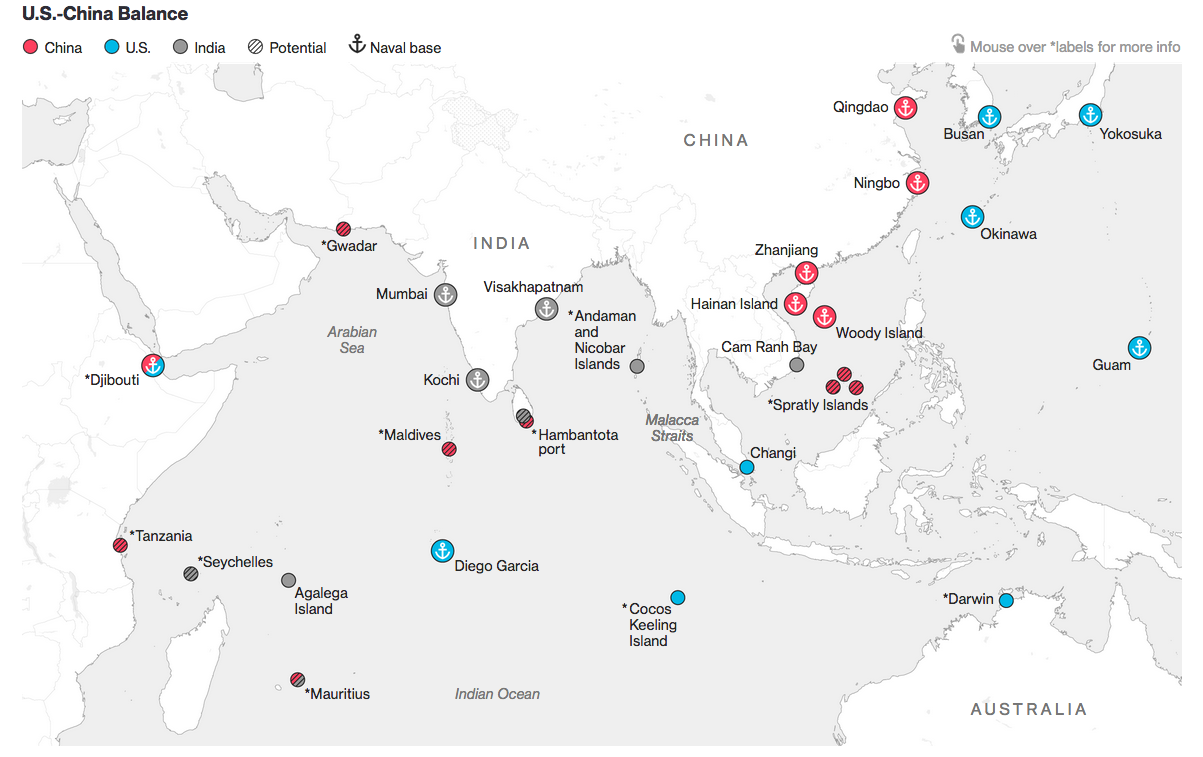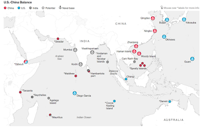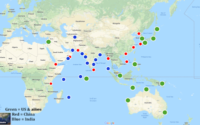 There are a certain missing links in the first map. First, India and US has signed naval treaties allowing each other to use the bases. Thus, the US influence should be measured in terms of Quad+two (US-Japan-Australia-India-Britain-France). That adds a few more bases. India has access to Chabbar in Iran (contentious though but accessible for friends), Australia has one more base in Indo-Pacific (others are purely pacific or southern facing). So my map goes like this.