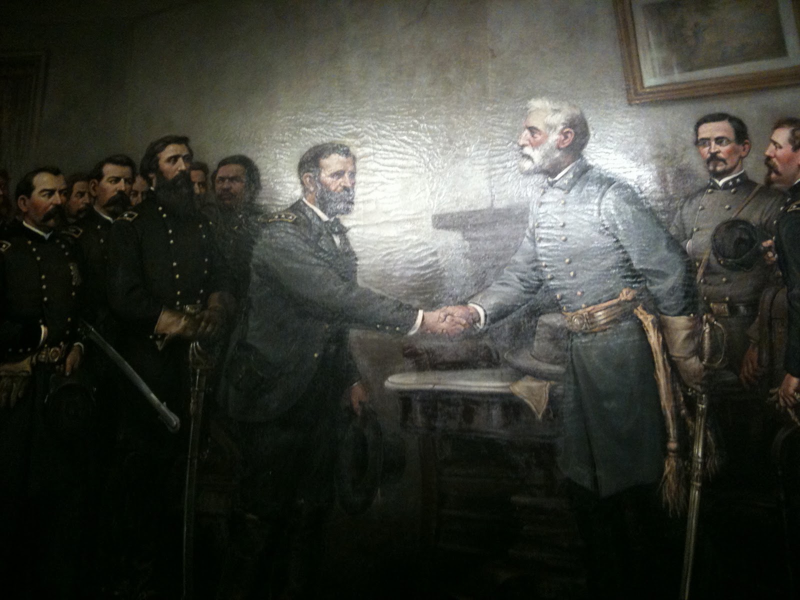 The famous Nast portrait of Lee surrendering to Grant, ending the Civil War, hangs in the Galena History museum.Did you know this is one of several artist renditions of this moment, but not a single one is entirely accurate? There was no artist or early tintype photographer present at the surrender, so it's drawn from the artist's imagination. The museum offered three other renditions, none so famous as the Nast painting, but each one was different. One had only a few people in attendance, one had so many they were clamoring at the door for a peek. A portrait of George Washington hangs on the wall in one version, as if to say the father of the United States is pleased and relieved to be watching over such a momentous occasion. Another painting, although historically inaccurate because they knew the event took place indoors, depicts the scene on a field with both armies in attendance—showing gaunt Confederate soldiers in tattered uniforms opposite well fed Union soldiers dressed in crisp uniforms astride fresh, strong horses. Artists do like to slip messages in, don't we . . . I mean, they?